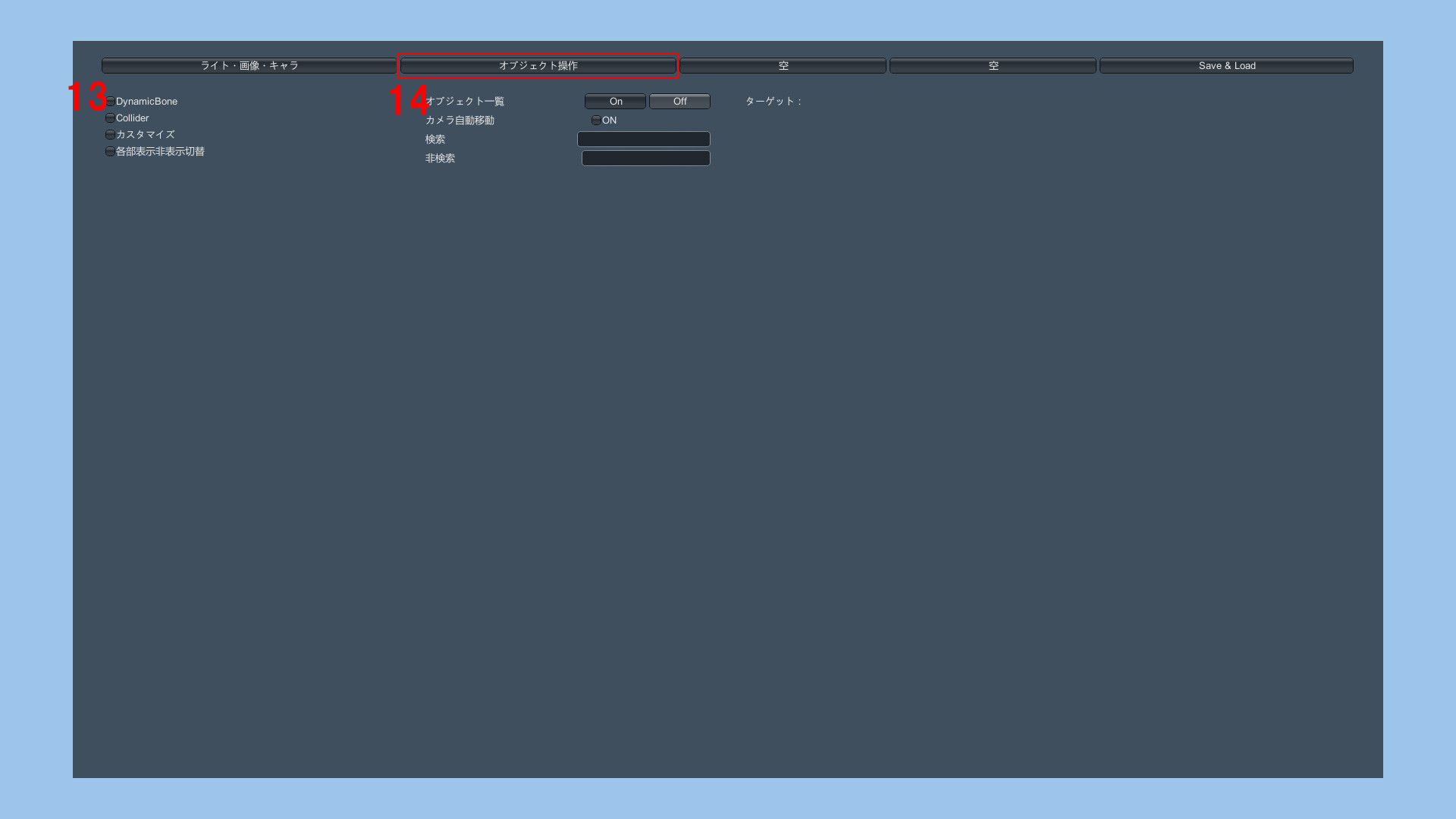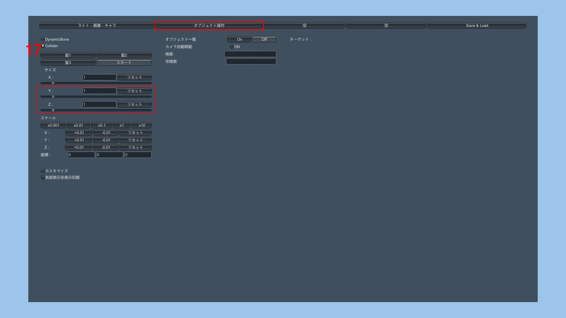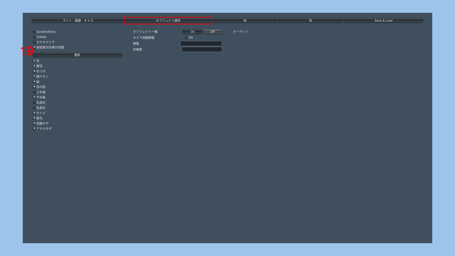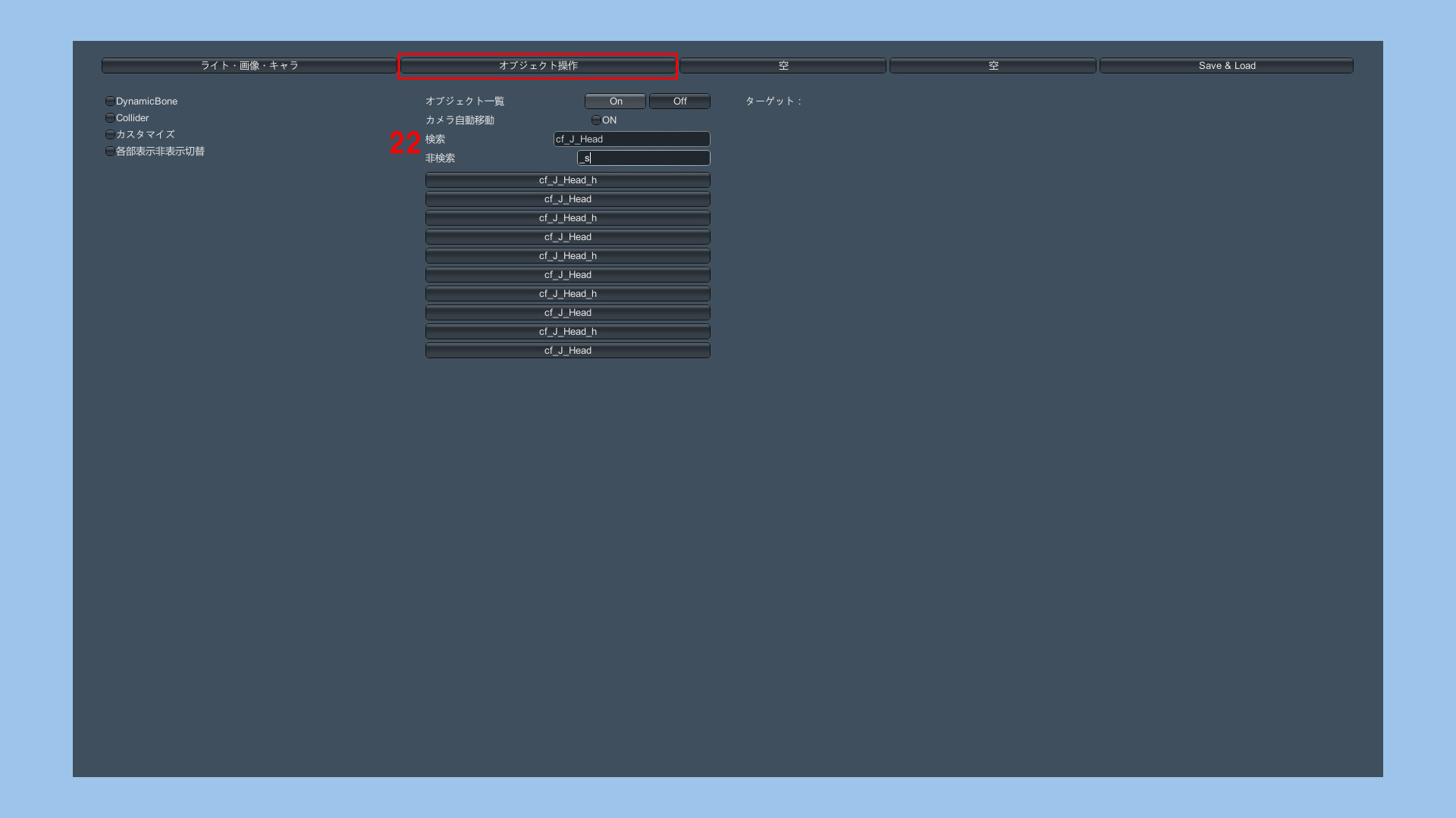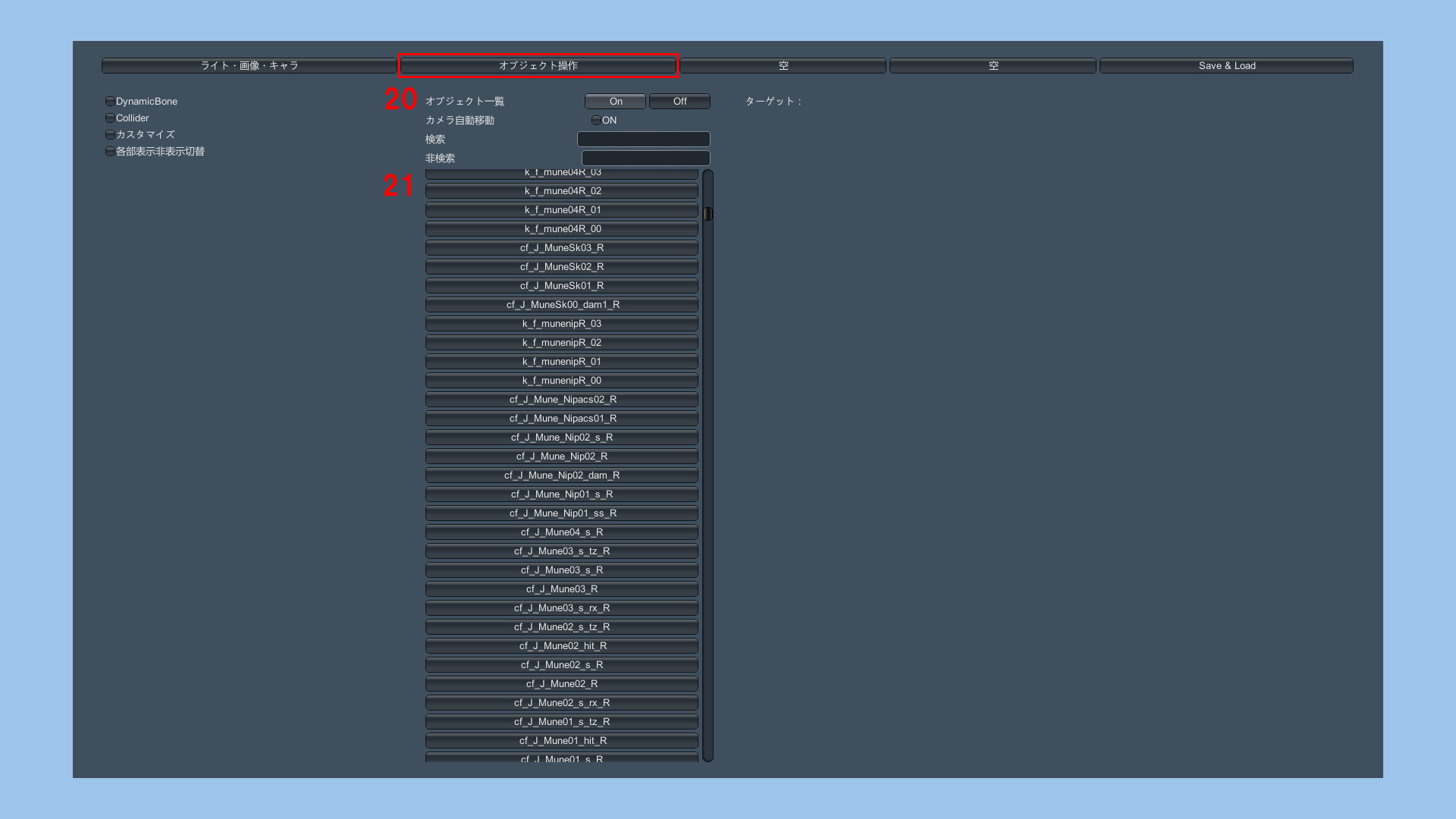 「オブジェクト一覧」を「On」にすると、今、読み込まれているオブジェクトが一覧表示される。