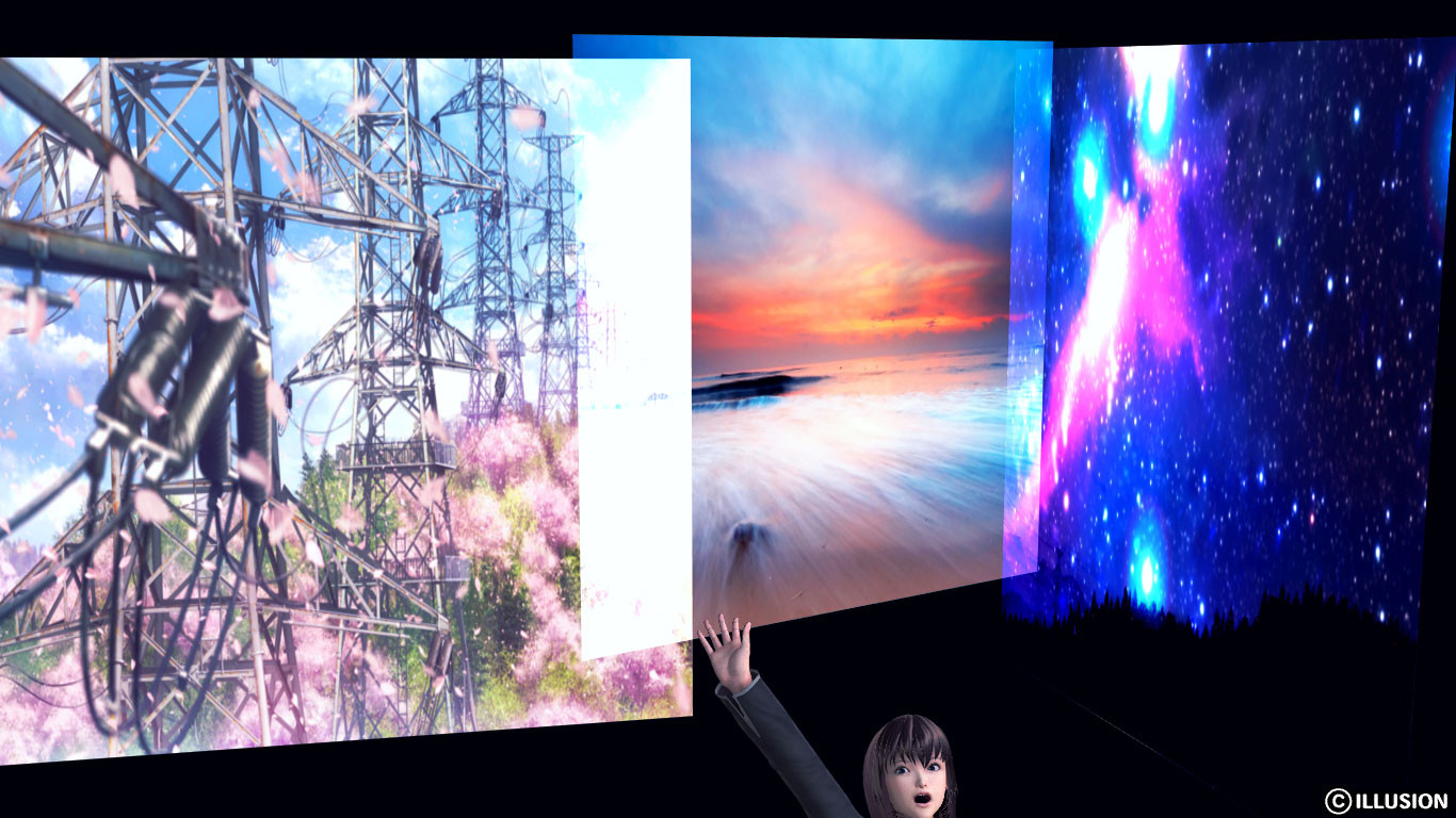 上の画像がまさにそれなんだけど、背景に使いたい画像をレンズフレアA(あるいはB)に貼ってやると拡大縮小は自由だし、角度も自由、裏から見る(反転させる)ことも可能だし、複数の画像を組み合わせてもいいわけだ。