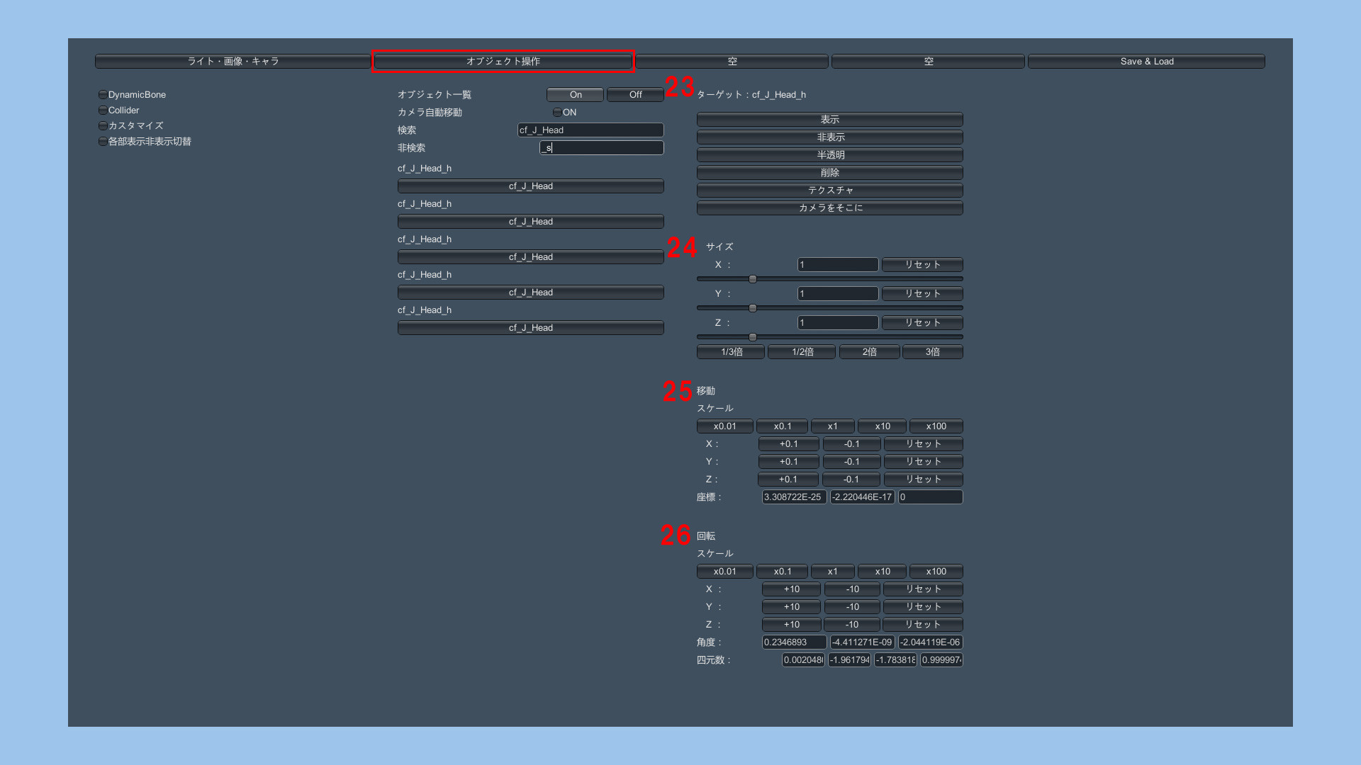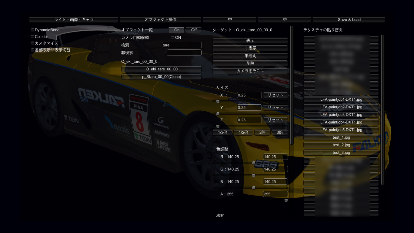 キャラクターごと、アイテムごとにテクスチャをいじってみたりサイズを変えてみたりってのができるようになったようなんだけど、それらの設定値を保存して再度読み込む術が思いつきません。