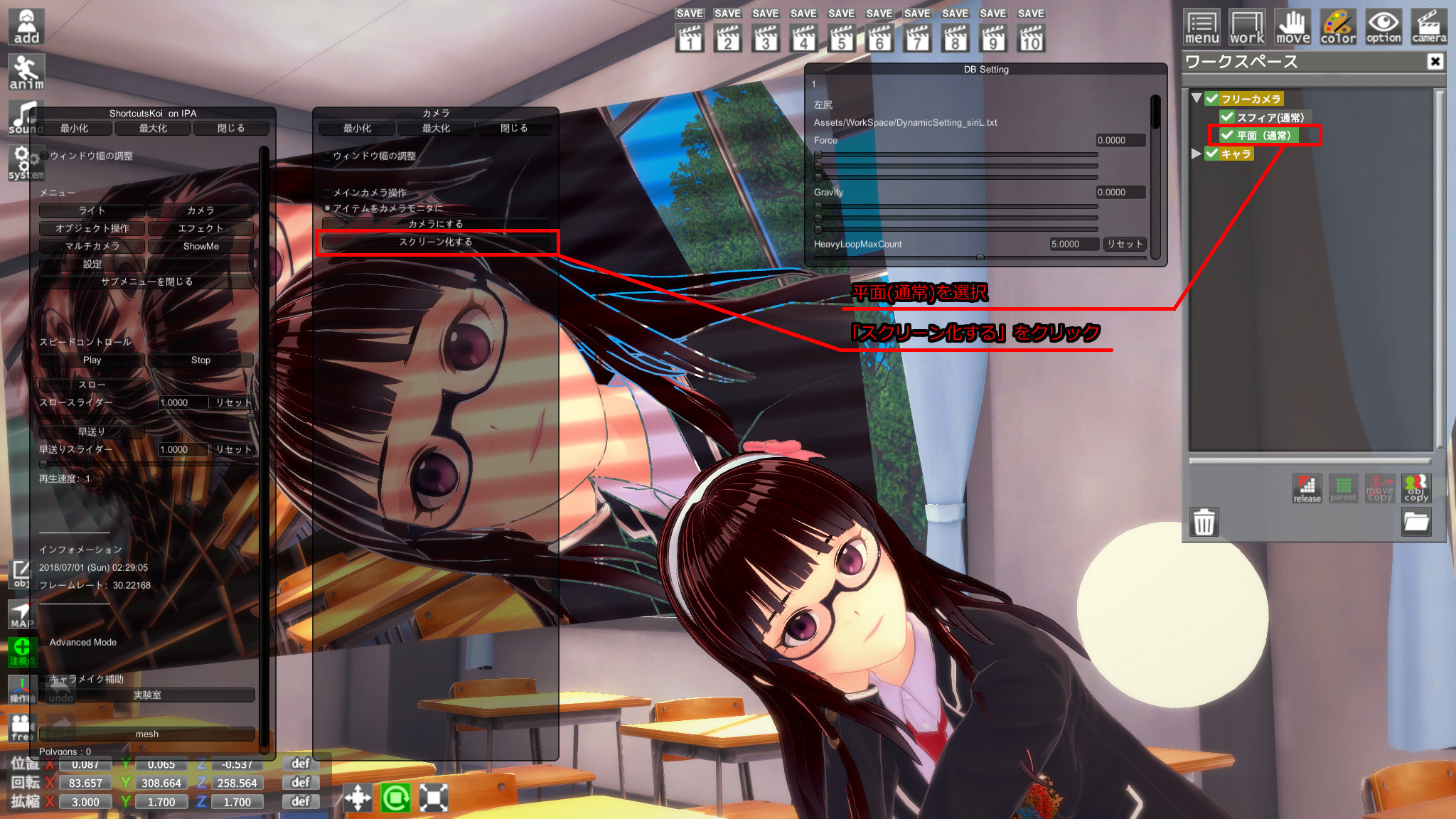 カメラにしたいアイテムを選択→ShortcutsKoiでカメラとして設定→スクリーンにしたいアイテムを選択→ShortcutsKoiでスクリーンとして設定