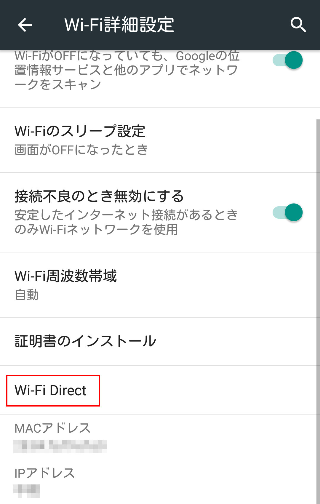 設定メニューからWi-Fiの項目をたどっていけば見つかる。